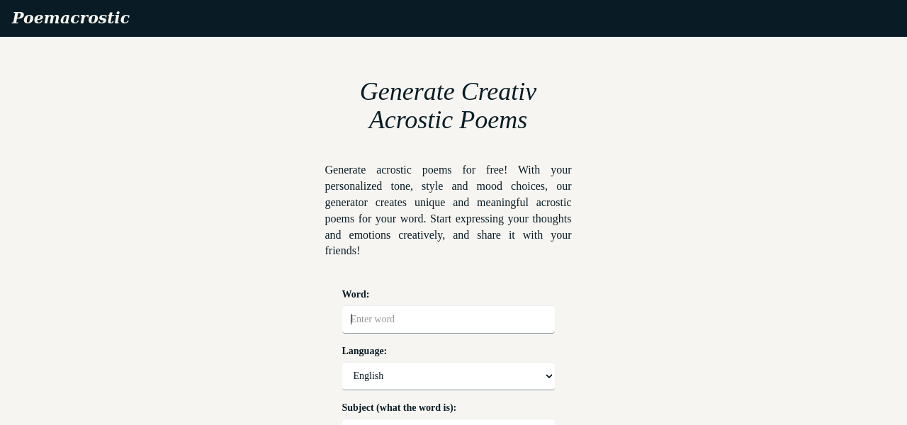 Create personalized acrostic poems in various moods and styles, for gifts, creative expression, and celebrations.
