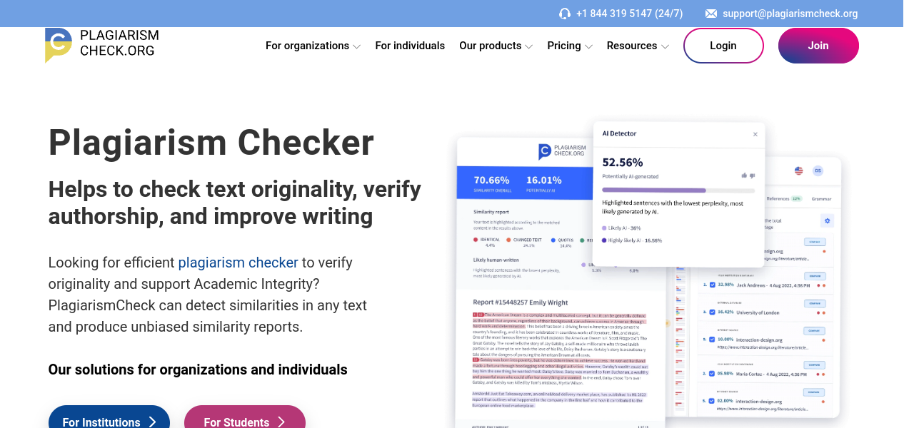 Plagiarism detection and AI-generated text identification for content publishers, editors, and educators.